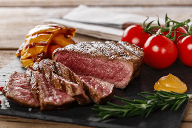 The steak is cooked to rare.