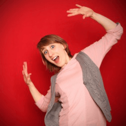 A woman recoils.