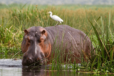 A hippopotamus is standing among the reeds along the bank of the river.