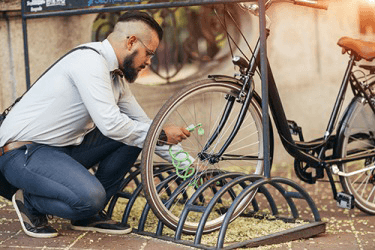 Owen reeves the lock through the bar to safely secure his bicycle while he is at work all day.