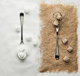 The refined white sugar is on the left, whereas the raw sugar on the right has a tan color.