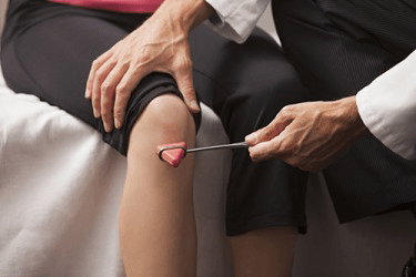 The doctor is performing a test of the patellar reflex on the patient.