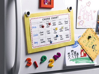Nick's mom put a chore chart on the refrigerator to remind him and his sisters about the household jobs they need to complete every day.