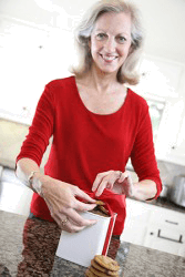 Linda's trick to make it appear as if her treats are homemade is to repackage store bought cookies into a tin and tie it with a pretty bow.