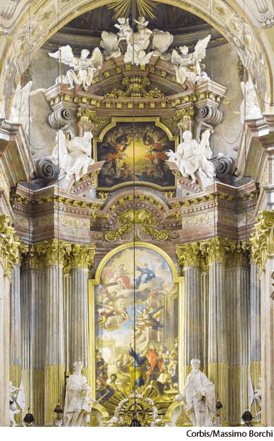 ba·roque AHD[bə-rōkʹ] D.J.[bəˈrəʊk]K.K.[bəˈrok]adj.(形容词)   baroquetop: interior of St. Peter's Church, Vienna, Austriabottom: façade of St. Gallen Abbey, St. Gallen, Switzerland- also Baroque Of, relating to, or characteristic of a style in art and architecture developed in Europe from about 1550 to 1700, emphasizing dramatic, often strained effect and typified by bold, curving forms, elaborate ornamentation, and overall balance of disparate parts. 也作 Baroque 巴洛克风格的:约1550到1700年间盛行于欧洲的一种艺术和建筑风格,属于、关于或有这种风格的特点的。这种风格强调戏剧效果,特征是有大胆的曲线结构、复杂的装饰和完全不同部分之间的整体协调