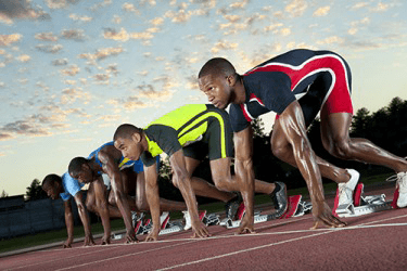 The runners awaited the starting gun in their respective lanes for the race.