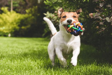 Murphy is always excited to retrieve the toy that his owner tosses across the yard.