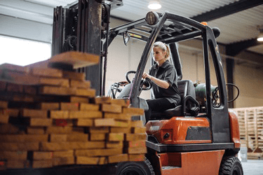 Theresa shifted the forklift into reverse after loading up the stack of wood.