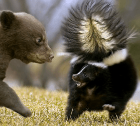 If the bear cub continues to bother the skunk, he might experience the revulsion of the skunk's pungent spray.