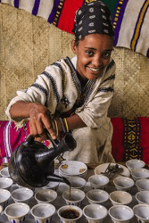 An Ethopian woman pouring robust coffee into cups.