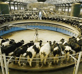 Dairy cows move on a rotation platform called a rotary milking parlor while getting fed, washed, and milked.