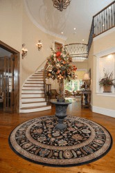 A round rug in the middle of a foyer.