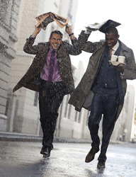 Todd and Carl rushed back to the office when a sudden downpour arose while they were out getting coffee for their coworkers.