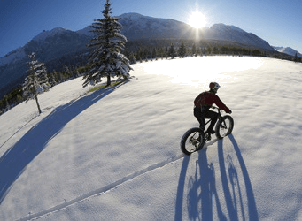 The bicyclist made a rut in the fresh snow with his fat tire bike.