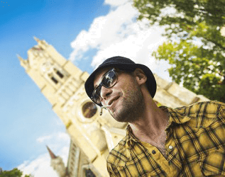 It might be considered sacrilege to wear a hat and sunglasses while smoking a cigarette when attending a church service.