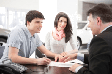 A couple talk to a car salesperson.