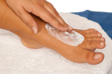 A person puts salve on their foot.