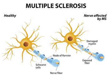 Multiple sclerosis damages the myelin that protects nerves and then forms scar tissue which causes various symptoms to occur.