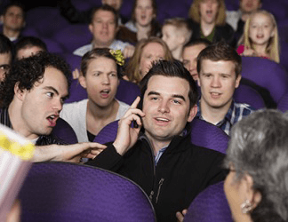 Corey was looked upon with scorn by the people in the theater because he was talking loudly on his cell phone during the movie.