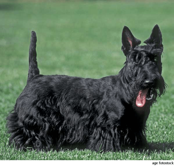 Scottish terriern.(名词) Scottish terrier- A terrier of a breed originating in Scotland, having a heavy-set body, short legs, a long head with small erect ears, and a hard, wiry coat. Also called Scotch terrier 苏格兰㹴狗:一种原产于苏格兰的㹴狗,敦实的身体,短腿,在长脑袋上长着两只小立耳,还有满身硬硬的毛皮 也作 Scotch terrier