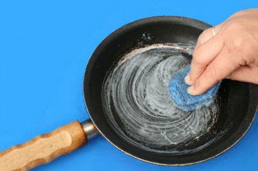 A person scours a dirty pan.