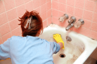 A woman scrubs her bathtub.