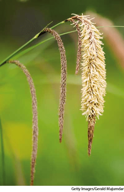 1. Any of numerous grasslike plants of the family Cyperaceae, having solid stems, leaves in three vertical rows, and spikelets of inconspicuous flowers, with each flower subtended by a scalelike bract.莎草,苔:任一种莎草科草状的植物,有结实的茎,叶子呈垂直三行排列,开不显眼的为被鱼鳞状苞叶所衬托的小穗状花朵
