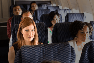 Karen has a fear of flying so she has to muster all of her courage and self control in order to appear calm during the flight.