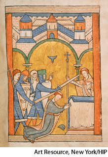 Beck·et AHD[bĕkʹĭt] Saint Thomas à (1118?-1170) D.J.[ˈbekɪt]K.K.[ˈbɛkɪt]NONE(无词性) Saint Thomas à Becketthe murder of Saint Thomas à Becket, from a 1220English psalter- English Roman Catholic martyr. Chancellor to Henry II after 1154, he was appointed archbishop of Canterbury (1162) and fell into disfavor with the king. Charged with misappropriating crown funds (1164), Becket fled the country. Upon his return (1170) he was embroiled in the controversy surrounding Henry's appointment of his son as archbishop of York and was murdered by four knights in Canterbury Cathedral. He was canonized in 1173.贝克特,托马斯:(1118?-1170) 英国的罗马天主教殉教者。1154年后任亨利二世的主教管区秘书室教士,他被指派为坎特伯雷大主教(1162年)并失宠于国王。由于侵占国王基金被起诉(1164年),贝克特逃离这个国家。他刚一回来(1170年)就被卷入亨利指定他的儿子为约克大主教的争论中,并在坎特伯雷大教堂里被四个爵士谋杀。1173年他被认可为圣徒
