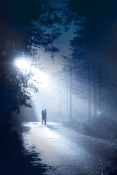 Moonlight shimmers through the trees.