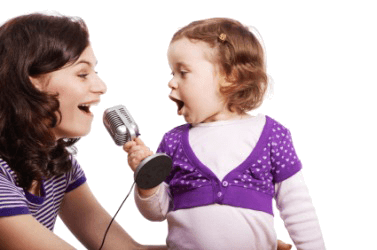 A llittle girl sings with her mother.