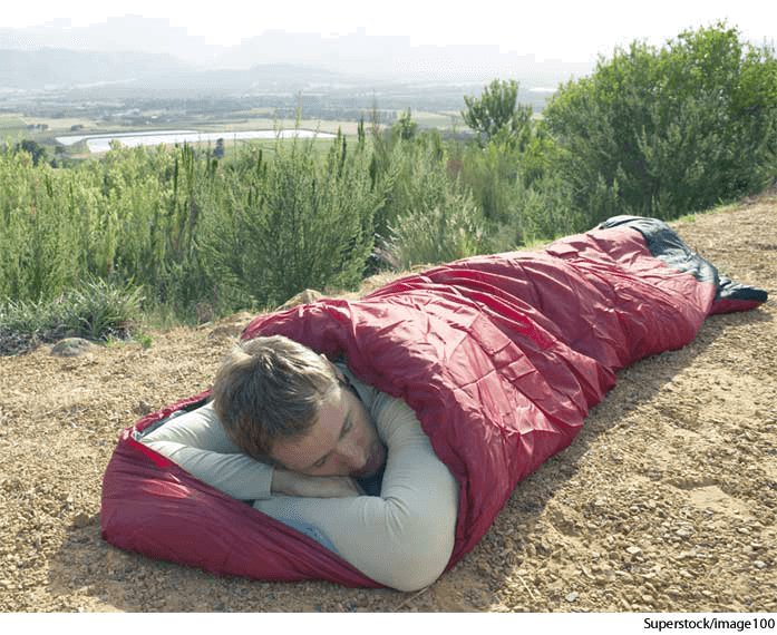 睡袋:一种用于睡眠的,加有暖和的衬里而且通常装有拉链的大袋子,尤指用于户外