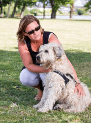 A woman teaching her dog to behave.