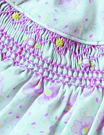 Needlework decoration of small, regularly spaced gathers stitched into a honeycomb pattern.