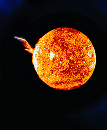 solar flaren.(名词) PhotoDisc, Inc.- A sudden eruption of hydrogen gas on the surface of the sun, usually associated with sunspots and accompanied by a burst of ultraviolet radiation that is often followed by a magnetic disturbance.太阳耀斑:太阳表面氢气的突然爆发,经常和太阳黑子有关并伴有紫外线辐射的爆发,从而导致磁干扰