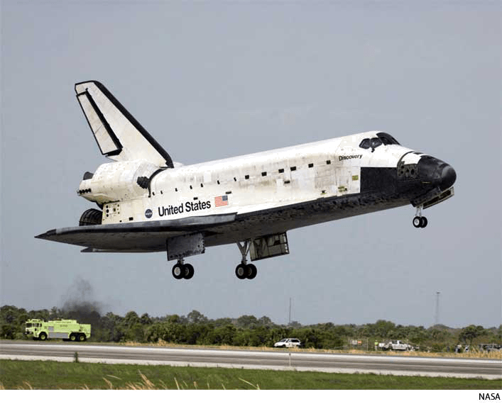 space shuttlen.(名词) space shuttlespace shuttle Discovery landing at Kennedy Space Center in Florida in March 2009 - A reusable spacecraft with wings for controlled descent in the atmosphere, designed to transport astronauts between Earth and an orbiting space station and also used to deploy and retrieve satellites.太空船:一种可重复使用的航天器,机翼可控制在大气中降落。该航天器用于在地球和运行轨道间运送宇航员,同时也用于部署和回收卫星
