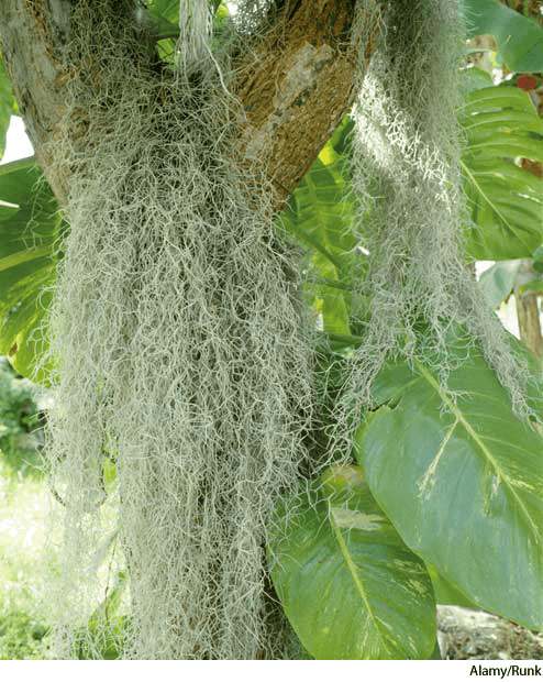 Spanish mossn.(名词) Spanish mossTillandsia usneoides- An epiphytic bromeliad plant(Tillandsia usneoides) of the southeast United States and tropical America, having gray threadlike stems drooping in long, densely matted clusters. 铁兰:一种产于美国东南部和热带美洲的附生凤梨属的植物(老人须 铁兰属) ,生有长长的密集成串的下垂的灰色线状茎