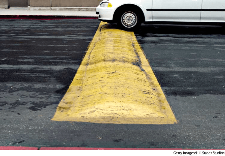 An artificial ridge set crosswise into the surface of a street, parking lot, or driveway to make the operators of vehicles decrease speed.