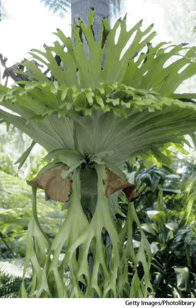 stag·horn fern AHD[stăgʹhôrn'] D.J.[ˈstægˌhɔːn]K.K.[ˈstægˌhɔrn]n.(名词) staghorn fernPlatycerium superbum- Any of several tropical epiphytic ferns of the genusPlatycerium, having large, dichotemously divided fertile fronds that resemble antlers. 鹿角蕨:一种鹿角蕨 属热带昙花蕨,有二叉的巨大的浓厚叶子,看起来很象鹿角