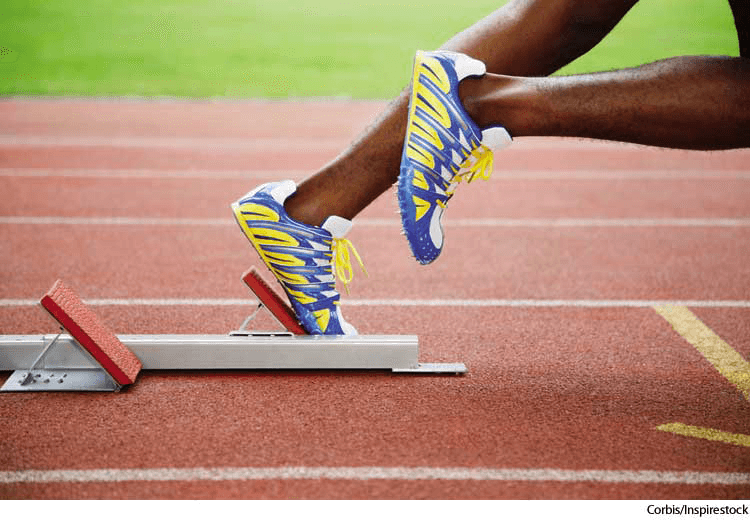 start·ing block AHD[stärʹtĭng] D.J.[ˈstɑːtɪŋ]K.K.[ˈstɑrtɪŋ]n.(名词) starting block- Sports An apparatus that braces a runner's feet at the start of a race, consisting of two angled supports adjustably mounted on a rigid frame that is usually anchored to the track.【体育运动】 起跑器:起跑时支撑运动员脚部的装置,包括一个硬架和装在硬架上的两块可调整角度的支撑块,硬架通常固定在跑道上