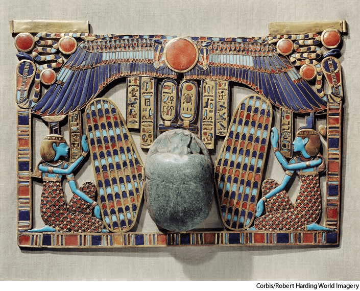 winged sun disk in the top center of a pectoral from the tomb of Tutankhamun