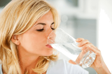 A woman swallows a glass of water.