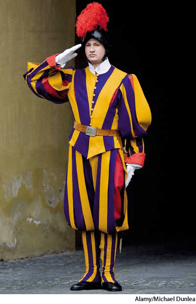 瑞士侍卫兵:瑞士裔军团中一名士兵,在梵蒂冈被雇佣做教皇侍卫