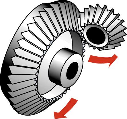 Either of a pair of gears with teeth surfaces cut so that they can connect unparallel gear shafts.