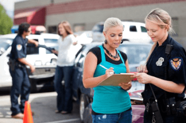This woman tells a police officer what she knows.