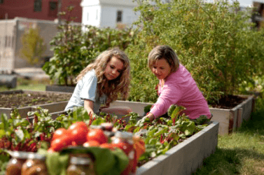 A mother and daughter tend a garden.