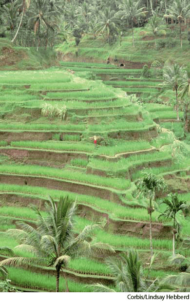 - To form (a hillside or sloping lawn, for example) into terraces.把(如山坡或坡地)修成梯田