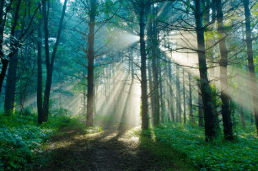 Threads of sunlight streaming through the trees.