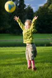 A little girl throws a ball.