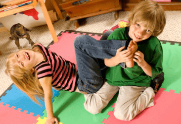 A boy tickles his sisters feet.